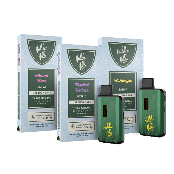 The Hidden Hills Live Sugar disposables come in 6 different flavor profiles in multiple strains.